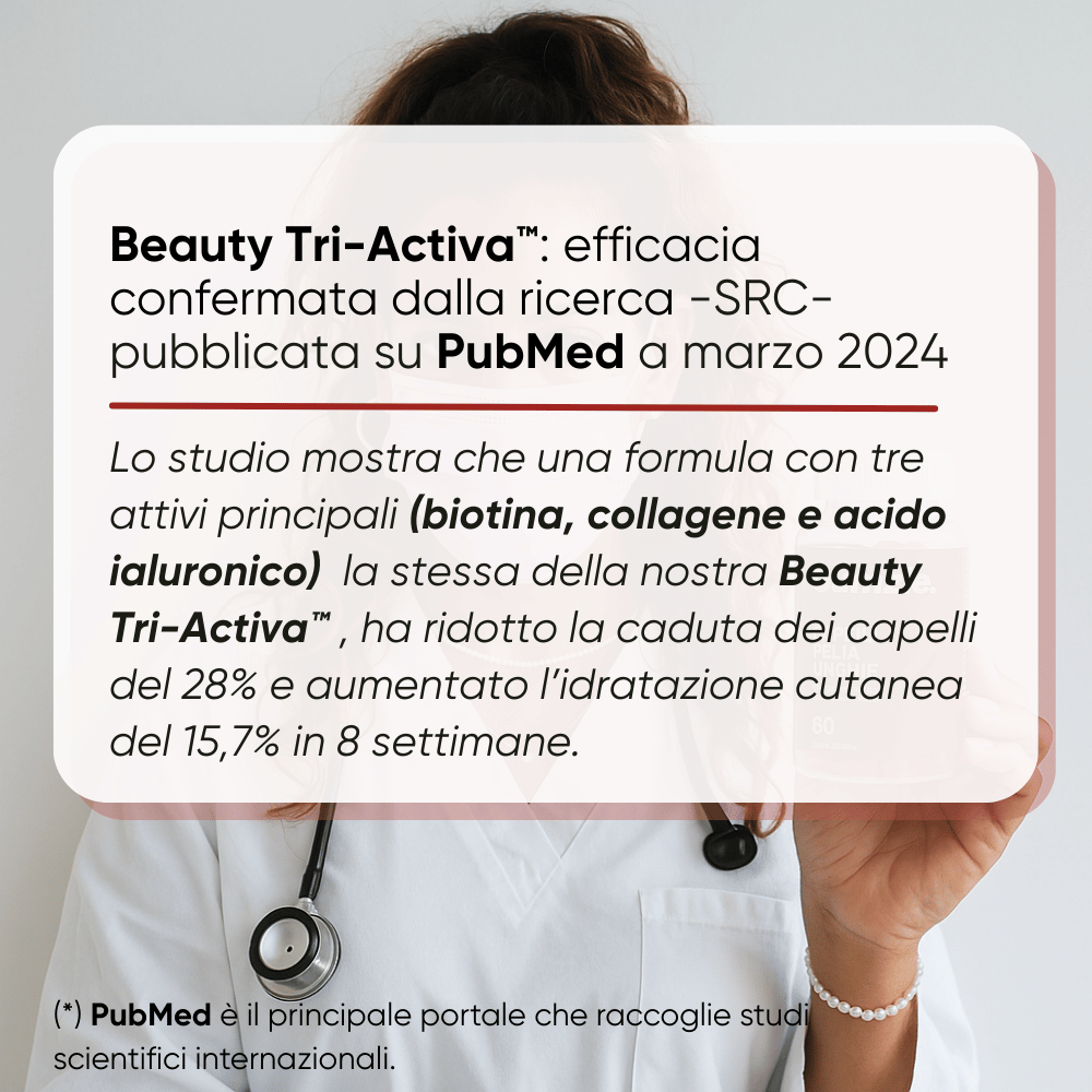 Uno studio su PubMed conferma che questa combinazione è la chiave per capelli sani. Noi siamo i primi a trasformarla in una caramella.